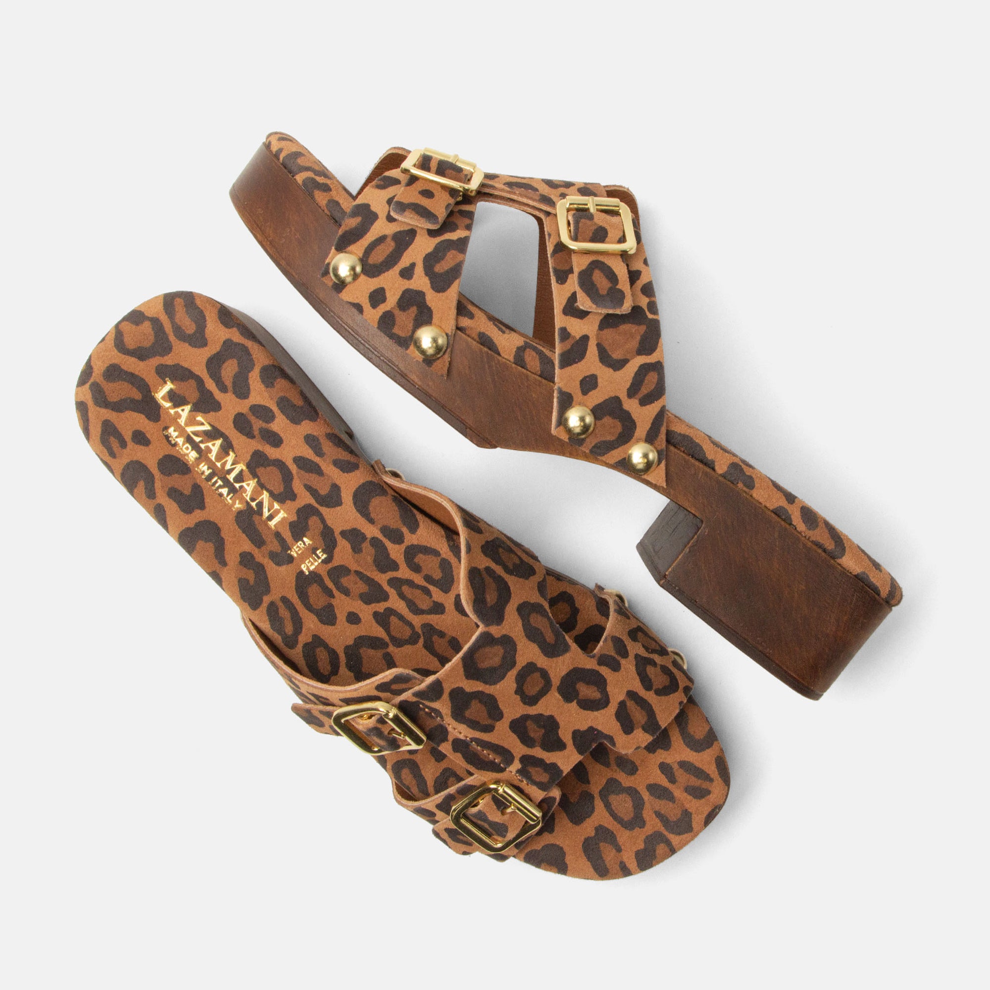 Deze clogs brengen een gedurfde dosis persoonlijkheid naar je zomergarderobe, met een mix van comfort en Italiaanse flair. De soepele suède bandjes met trendy luipaardprint voelen luxe aan, gecomplementeerd door de goudkleurige gespen en studs. De donkere houtlook blokhak van 3,5 centimeter biedt stabiliteit en loopt verrassend comfortabel dankzij het met suède beklede voetbed dat zacht meeverend aanvoelt. Combineer ze met een luchtige jurk, een linnen broek of een straight jeans voor een look die moeiteloos vrouwelijk, speels en eigenzinnig is – helemaal Lazamani.