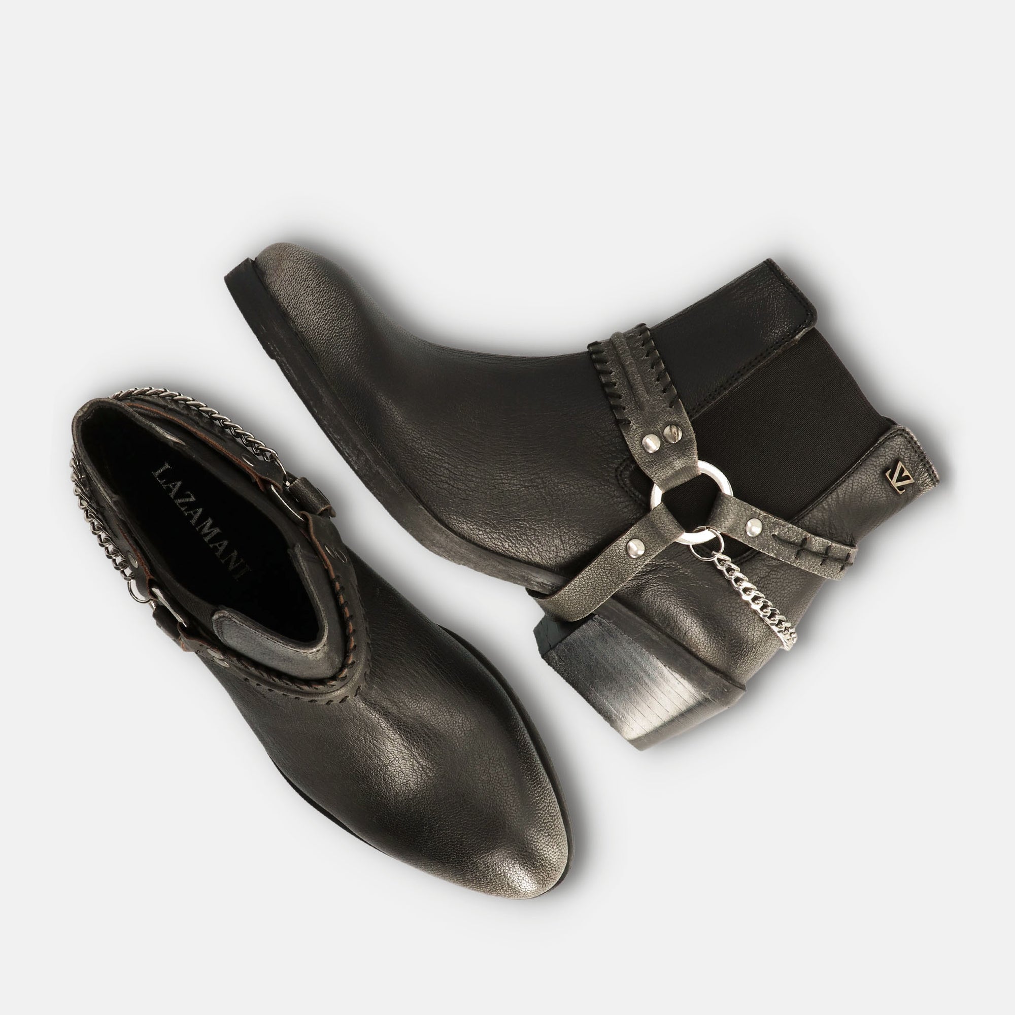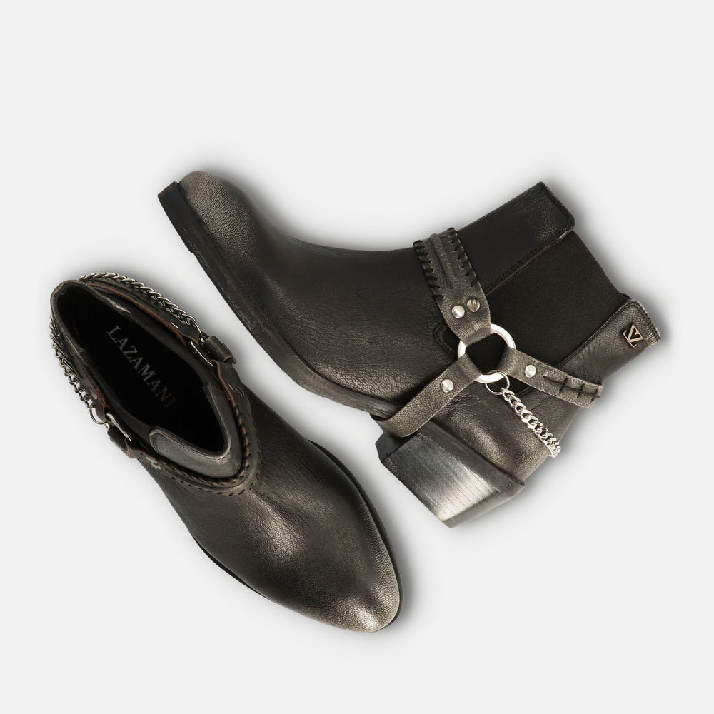 Twee looks met één paar. Deze Lazamani enkellaarsjes zijn stoer met een knipoog. Dankzij het leer met vintage metallic finish, de chunky chain en western-geïnspireerde strap zijn ze een blikvanger onder al je outfits. Voor een meer ingetogen look kun je de strap eenvoudig verwijderen middels een knoopsluiting. Dankzij de elastische inzetstukken trek je ze moeiteloos aan en zitten ze de hele dag comfortabel. Combineer met een jeans of leuk jurkje voor een edgy touch.