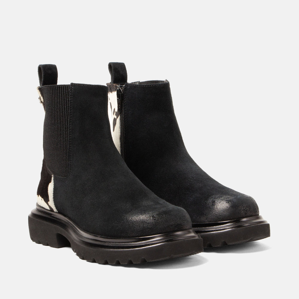 Deze zwarte dames boots met cowprint details aan de hiel zijn allesbehalve basic. Het zachte suède en het speelse contrast van zwart-wit ponyhair zorgen voor een edgy-uitstraling, helemaal on-trend voor dit seizoen. Dankzij de combinatie van een ritssluiting en een elastisch paneel aan de andere zijde, stap je er makkelijk in - klaar om te genieten van een comfortabele en stoere stijl in één. Combineer ze met bijvoorbeeld een jeans en oversized blazer of juist met een midi-jurk voor een verrassend contrast. Deze boots zijn ontworpen voor de modebewuste vrouw die durft op te vallen.