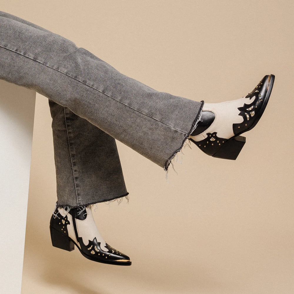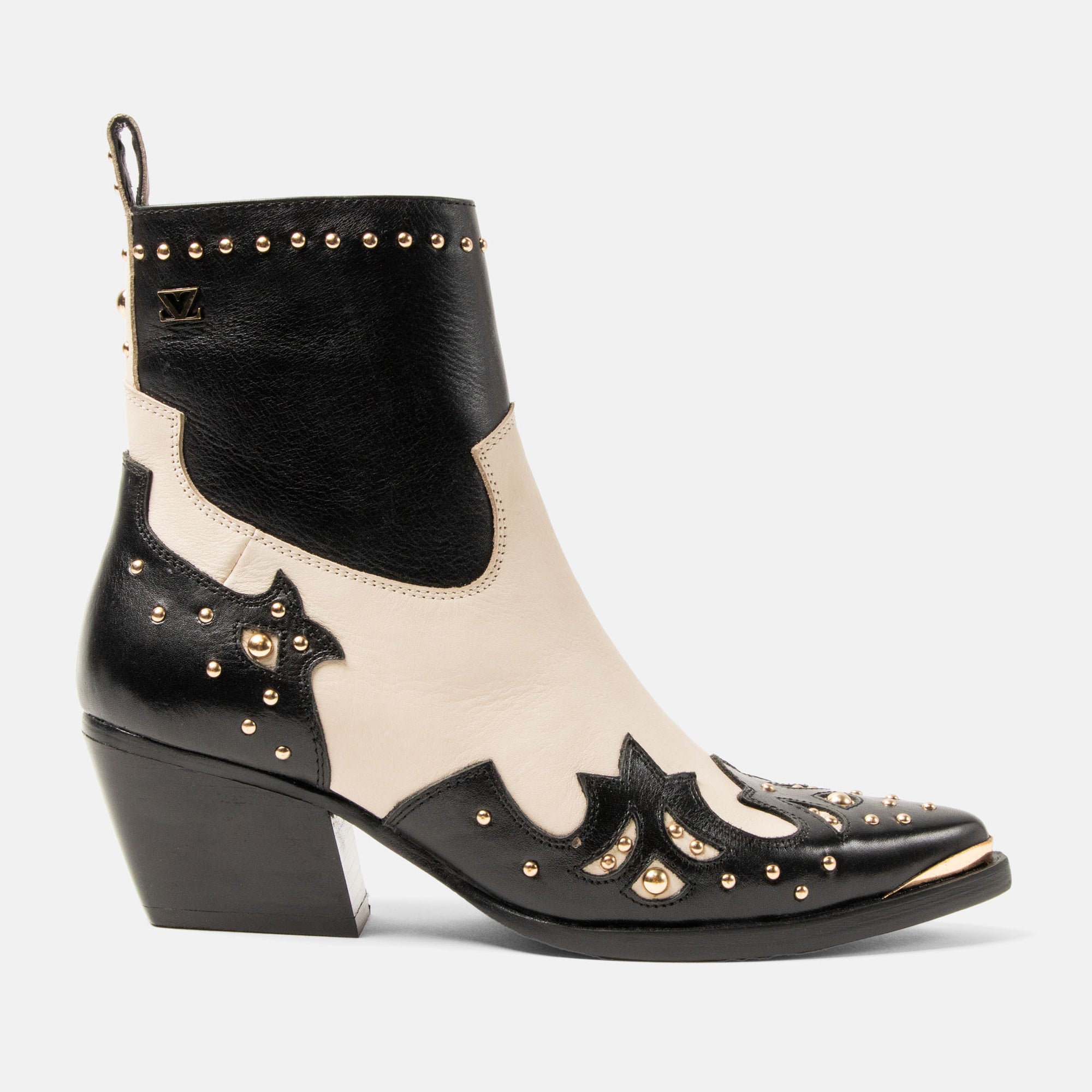 Deze trendy enkellaarsjes vallen op door westernaccenten en de contrasterende kleurencombinatie van zwart en wit. Subtiele studs versterken het karakter, wat ze echte blikvangers maakt. Ze zijn gemaakt van hoogwaardig glad leer met een ritssluiting aan de zijkant voor aantrekgemak. De zachte textielvoering en het zachte leren voetbed zorgen voor extra comfort, terwijl een stevige blokhak van 5 centimeter je subtiel wat extra lengte geeft. Perfect om jouw outfit nét dat beetje extra flair te geven – van skinny jeans tot een zwierige jurk.
