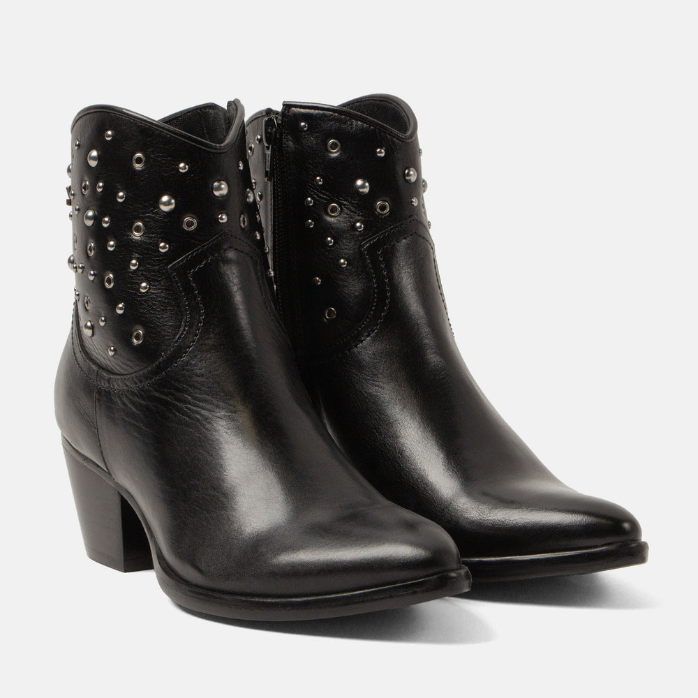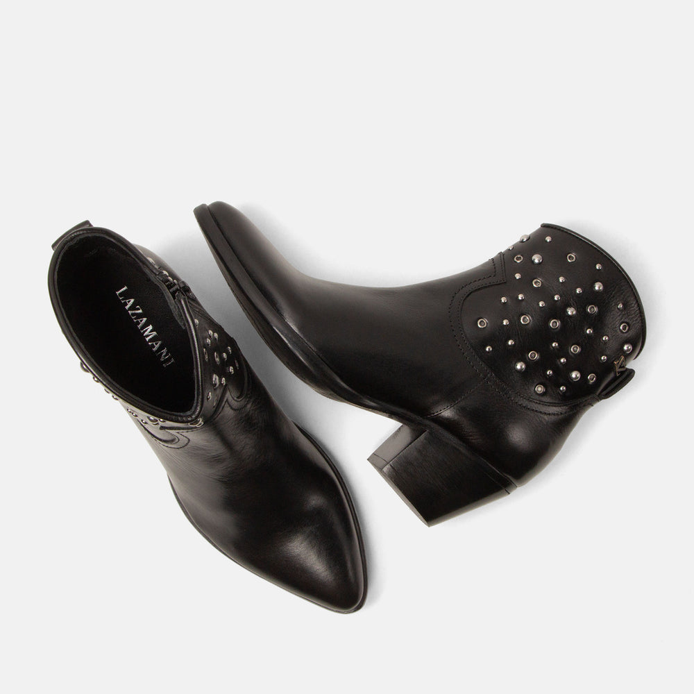 Maak een stijlstatement met deze zwarte leren enkellaarsjes van Lazamani. Het gladde leer straalt luxe uit, terwijl de zilverkleurige studs en eyelets zorgen voor een edgy, eigentijdse twist. De 5 cm hoge blokhak geeft je net dat beetje extra lengte en blijft comfortabel om de hele dag te dragen. De ritssluiting maakt het aan- en uittrekken eenvoudig en de zachte voering met leren voetbed zorgt voor draagcomfort. Perfect om een stoere touch te geven aan je favoriete jeans, leren broek of zelfs een zwierige jurk.